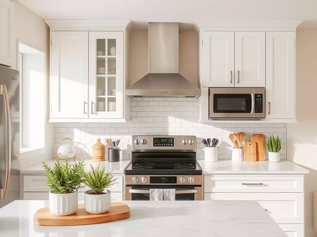 Modern renovated kitchen with freshly painted cabinets and new hardware, no text, no words, no typography